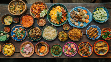 A wooden table filled with a variety of Sundanese village specialties, surrounded by colorful plates of traditional dishes, ready to serve.