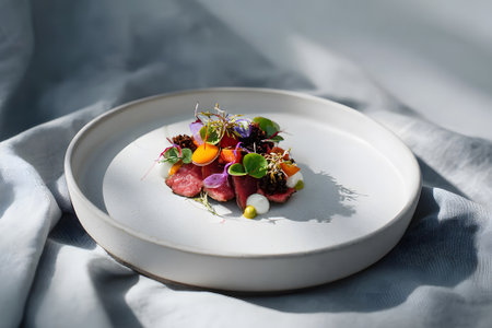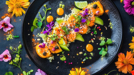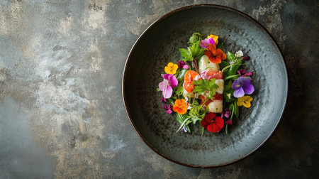 A stunning modern dish featuring fresh vegetables and vibrant edible flowers, beautifully arranged on a textured plate, perfect for gourmet dining.
