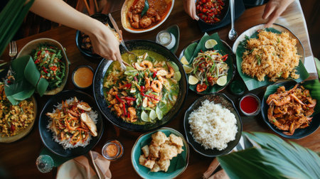 An overhead view of served with an assortment of Thai condiments and side dishes, creating a colorful and appetizing spread on a traditional Thai dining table.