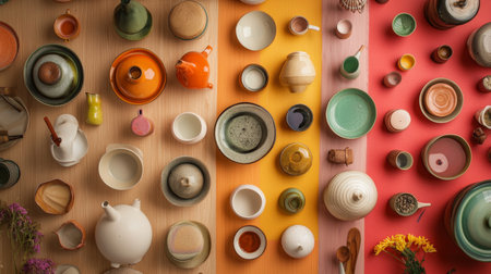 A variety of colorful ceramic plates arranged in a playful and creative flat-lay composition, highlighting their artistic appeal.