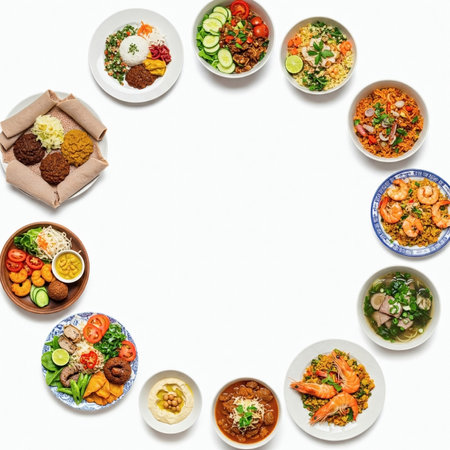 High-angle view of a colorful street food market showcasing dishes from different cultures and countries