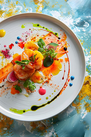 An exquisitely plated gourmet dish viewed from directly above, showcasing culinary artistry. The white plate features vibrant swirls of beetroot and mango puree, dollops of pesto, delicate foam, and is garnished with microgreens and edible flowers.