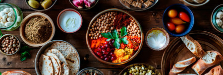 a vibrant Mediterranean mezze spread, various dishes, rustic table