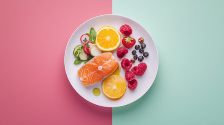 Healthy fitness meal with lean proteins, whole grains, and superfoods, top-down composition on a stylish minimalist paper background. Generative AI