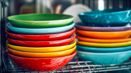 close-up of dishwasher racks filled with colorful plates, created with generative ai