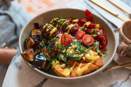 Exotic Kibbeh in a Roasted Vegetable Buddha Bowl with Pumpkin, Tomato, and Eggplant for a Gourmet Brunch