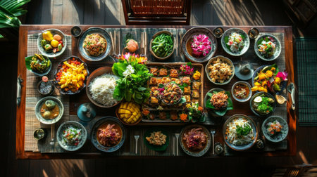 A stunning overhead view of a Thai feast, showcasing a variety of colorful dishes such as Som Tum, Pad Krapow, and mango sticky rice, perfect for celebrating a special occasion.
