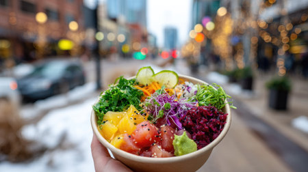 Hand holding a poke bowl with fresh ingredients, ready for takeout, against a city street background