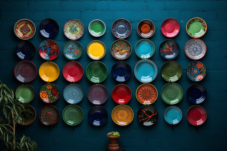array of bright painted plates at a ceramic stall, created with generative ai