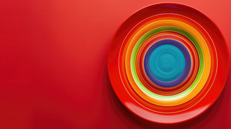 Series of colorful concentric circular plates on red background