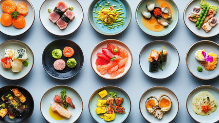 Plated appetizers and colorful food on small bowls filling a table, presenting an elaborate selection of culinary art for a luxurious gastronomy event