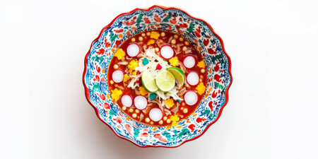 A vibrant Mexican pozole, with a rich hominy and pork stew garnished with shredded cabbage, radishes, lime wedges, and tortilla chips, served in a colorful ceramic bowl. The dish looks hearty and flavorful.