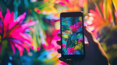 A hand holding a smartphone showcasing a striking screen filled with tropical foliage patterns. The colorful background enhances the vibrant design, perfect for nature and tech lovers.