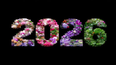 A stunning floral display showcases the numbers 2026, using an array of colorful flowers and vibrant petals set against a sleek black background.