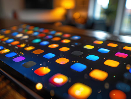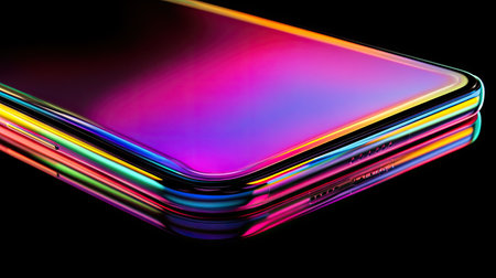 Close-up of a blank smartphone screen with colorful reflections, against a shiny black background