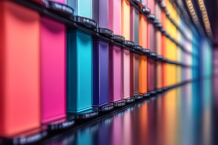 A vibrant and dynamic display of diverse color samples arranged in a gradient. perfect for creative projects, examining color theory, or as inspiration for modern design. emphasizes a spectrum of hues reflecting light in a sleek, polished setting. Generative AI