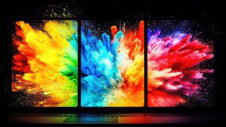 Three high-resolution laptop screens radiate bright colors against a dark background, creating a futuristic atmosphere.