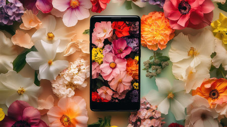 A beautifully styled smartphone showcases a vibrant floral display, surrounded by a variety of blooming flowers. This image captures the essence of modern technology integrating with nature's beauty, perfect for creative projects or marketing campaigns.