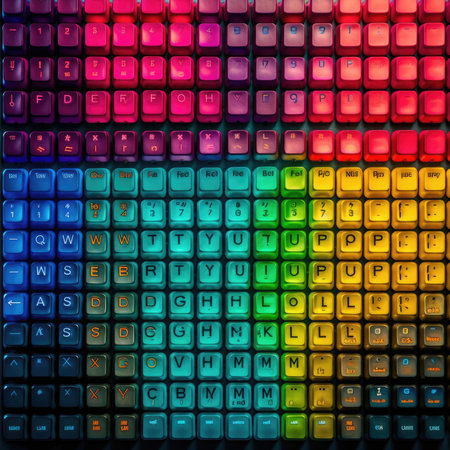 Multicolored computer keyboard keys with the letters of the English alphabet, colorfull rainbow palette background pattern