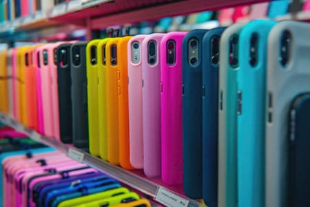 An array of colorful mobile phone cases on display shelves in a store, offering a wide selection for different tastes and preferences