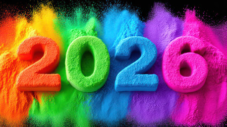Three-dimensional textured 2026 numerals in orange, pink, cyan, and purple with rainbow powder explosion background.