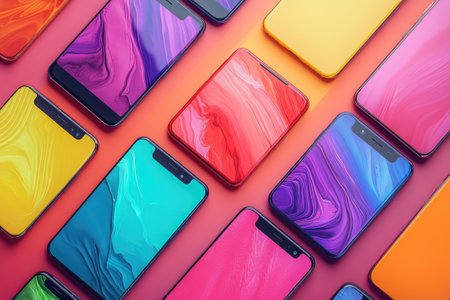 A collection of mobile phones lies scattered on a bright, multicolored surface, each displaying a distinct and artistic wallpaper. The lively patterns create a playful and dynamic composition.