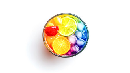 Rainbow cocktail with ice and fruit slices refreshing summer drink