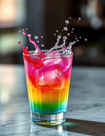 A refreshing drink with colorful ice cubes in a stylish glass. Perfect for summer gatherings, this vibrant beverage enhances any kitchen or party atmosphere.