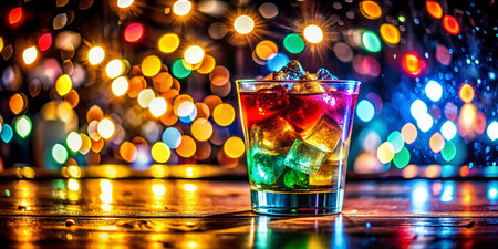 A colorful cocktail glass with a vibrant bokeh lighting background, creating a festive and stylish atmosphere.