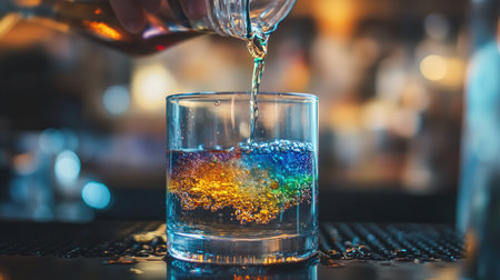A captivating image showcasing a colorful drink being poured into a glass, featuring vibrant swirls and a lively bar atmosphere, perfect for nightlife themes.