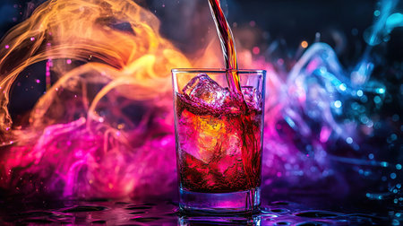 Colorful beverage being poured into a glass with ice in a vibrant atmosphere