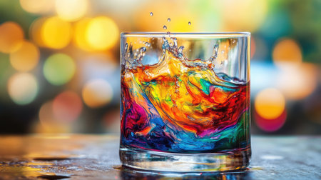 A stunning close-up of a vibrant splash of colorful liquid in a glass, set against a beautifully blurred bokeh background, showcasing dynamic movement.
