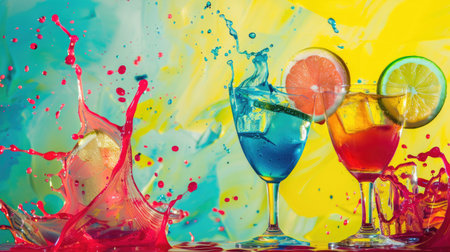 Vibrant drinks splash in colorful glasses, showcasing refreshing bubbles and brightness.