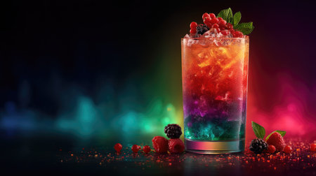 This vibrant, colorful layered drink showcases refreshing fruits and ice. Perfect for summer, parties, or mixology themes, it brings a modern aesthetic to any project.