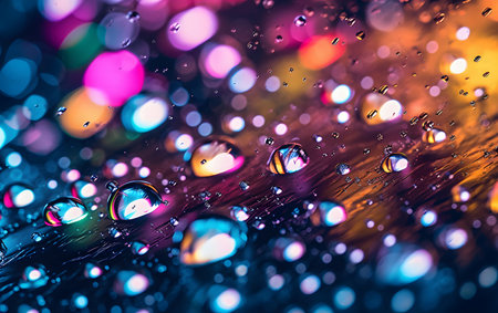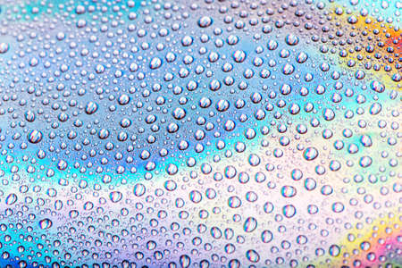 Abstract image of water droplets on glass surface reflecting with multicolored background.