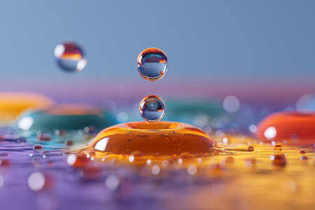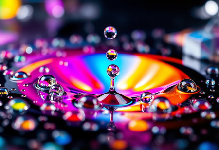 A close-up macro shot captures a single water droplet creating colorful, iridescent ripples on a liquid surface, with small bubbles forming around the edges. Clear details and vibrant colors enh...