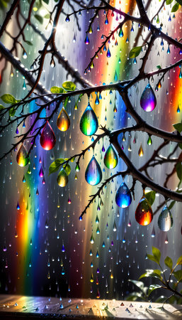 Raindrops on a tree in the rain with rainbow and colorful background