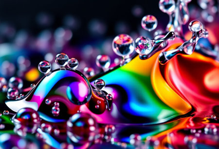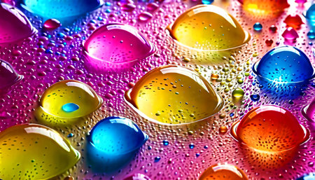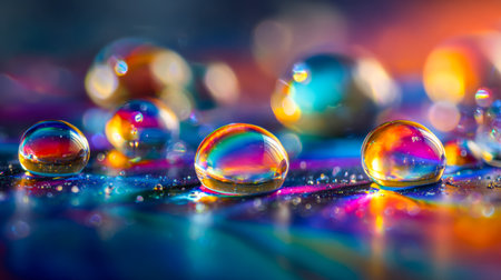 Several water bubbles reflect a spectrum of colors on a colorful background, creating a vibrant atmosphere.