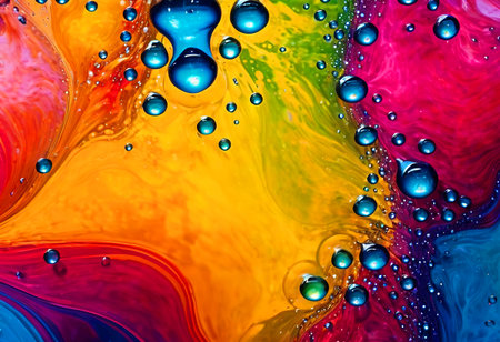 Bright abstract colorful liquid background with transparent multi-colored drops and bubbles