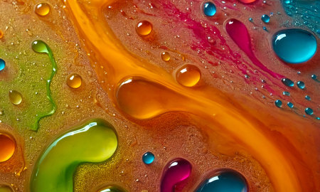 Close-up of bright abstract colorful liquid background with drops, splash and bubbles