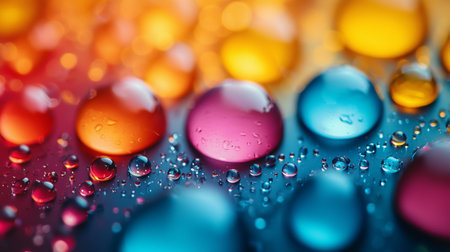 Brightly colored water droplets gather on a smooth surface, reflecting vibrant hues and creating visual art.
