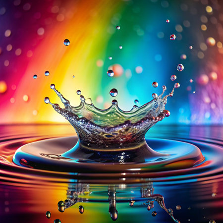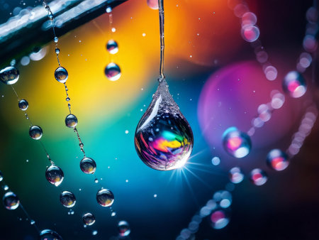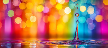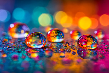 Brightly hued droplets catch gentle light amid a vivid, blurred backdrop, creating an enchanting scene full of ripple and rainbow-inspired glow.