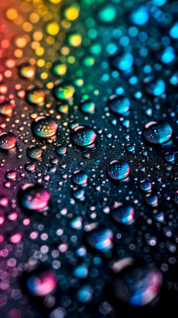 Vibrant water droplets on a surface with rainbow reflections