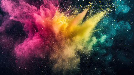 Dynamic color powder splash captured mid-explosion with vibrant pink, yellow, and green dust floating in the air. Isolated on a dark backdrop for high contrast and dramatic visuals.