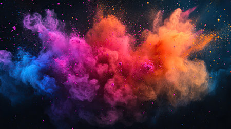 This captivating image showcases a vibrant explosion of colorful powder and confetti, creating a dynamic and joyful atmosphere perfect for festive events.