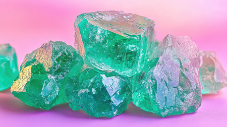 A stunning collection of green crystals showcases unique textures and sparkling surfaces, resting against a soft pink background, perfect for artistic projects.