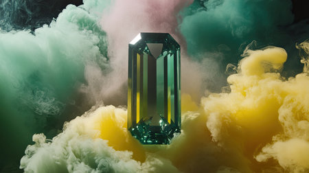 This stunning image features a vibrant emerald gemstone surrounded by soft, colorful smoke that creates an artistic and dramatic atmosphere, emphasizing luxury and beauty.