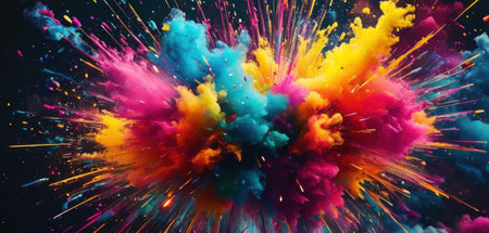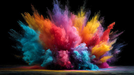 Vibrant explosion of multicolored powder against a black background, creating a dramatic burst of energy
