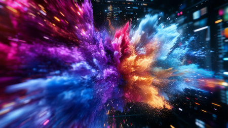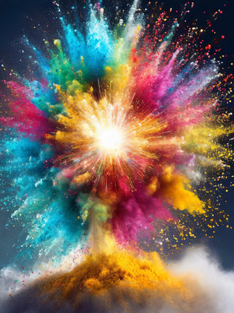 Colorful powder bursts forth in a spectacular display, illuminating the dark surroundings with vibrant hues. The energetic explosion captures the spirit of joy and creativity.