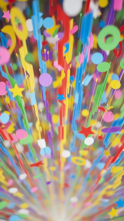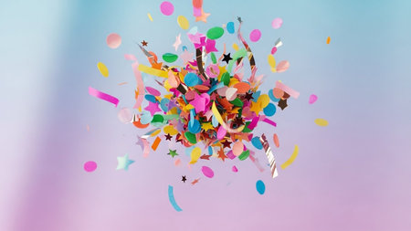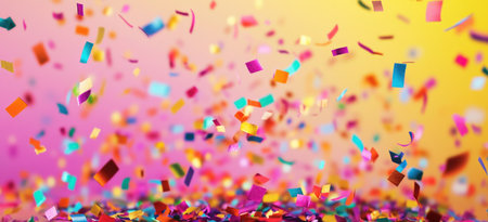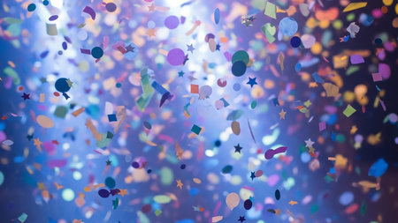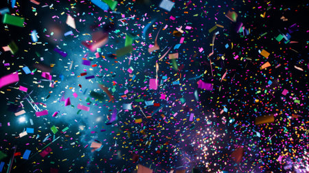 A vibrant shower of colorful confetti fills the sky, creating a joyful atmosphere for celebrations, parties, or festive events. Perfect for cheerful backgrounds.